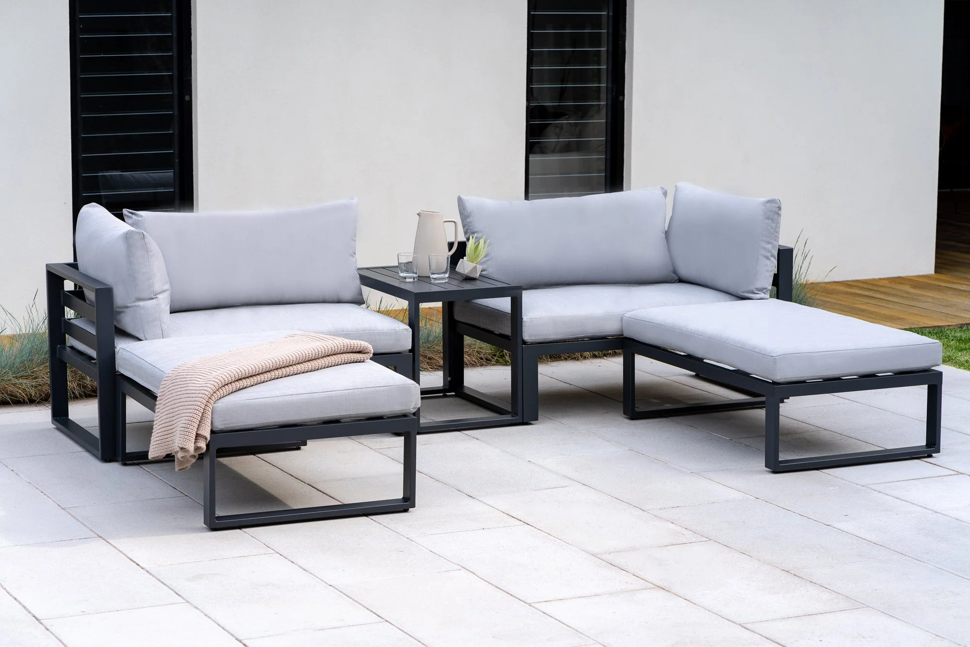 The Santorini collection allows ultimate versatility with a modular construction. The Santorini Lounge Set comprises two seats, two ottomans and a coffee table that can be configured to suit the requirements of the space it is in. This contemporary collection is crafted using powder coated metal.